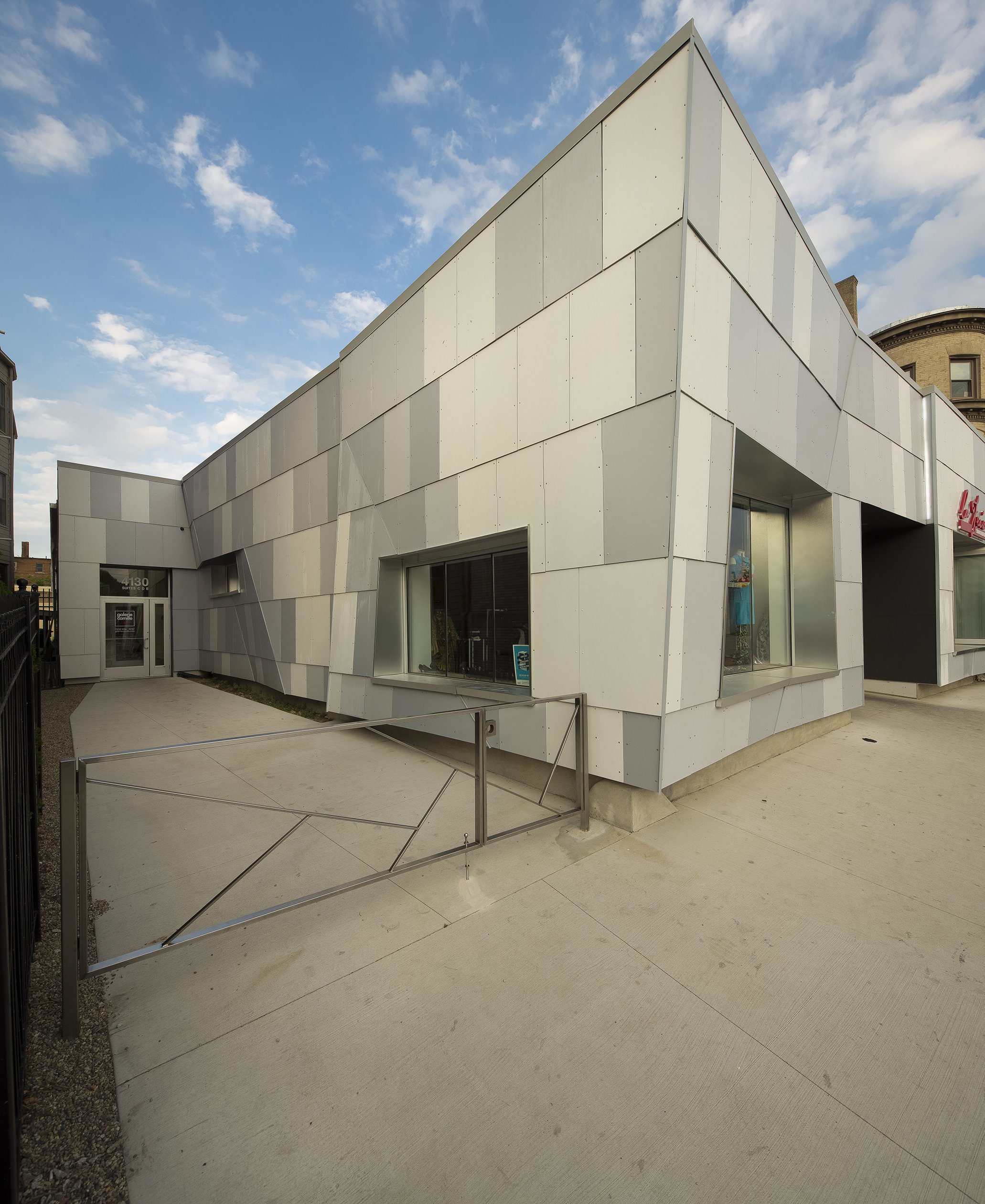 A composition of creases and folds, and a variegated color scheme provides for a sense of movement and curiosity. Contextually, the new façade relates to the depth and texture of the neighboring historic structures. Additionally, an arrangement of two storefront windows and a central recessed entrance reinstates the retail nature of the building. The end result is a compelling and energetic contribution to an emerging creative district.