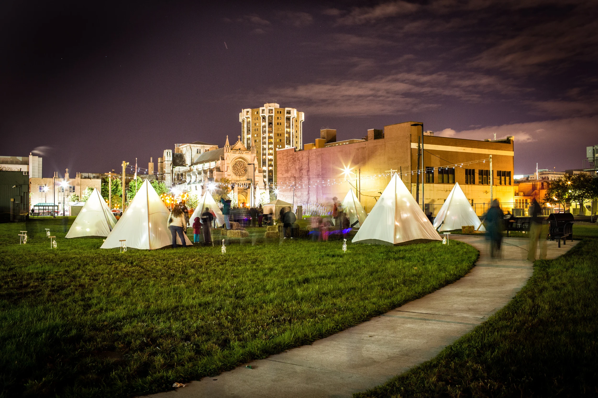 A circle of glowing tents in the wide-open urban prairie, invite children (and kids at heart) to explore the magical shelter of light and fabric. On the scale of the site, lights form large geometries, outlining a place as a beacon for gathering and wonder.