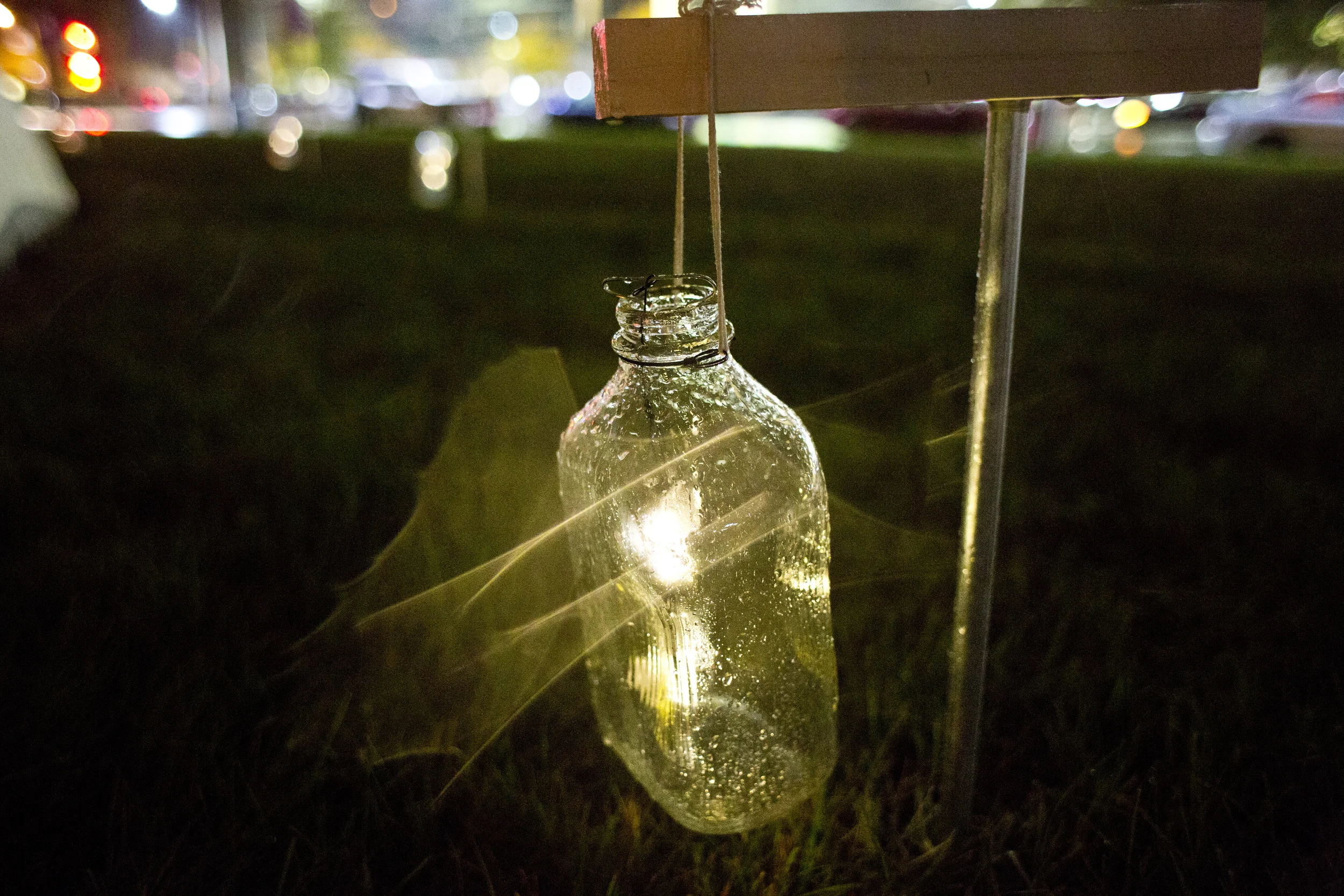 Hand-made, battery-powered luminaires are whimsical interpretations of overhead ‘power lines’ and ‘firefly traps.’ On the scale of the shelter, lights inside the tents create individual, magical spaces. Flashlights, shadow puppets and light collages with unique narrative frameworks encourage a playful and participatory personal experience within.