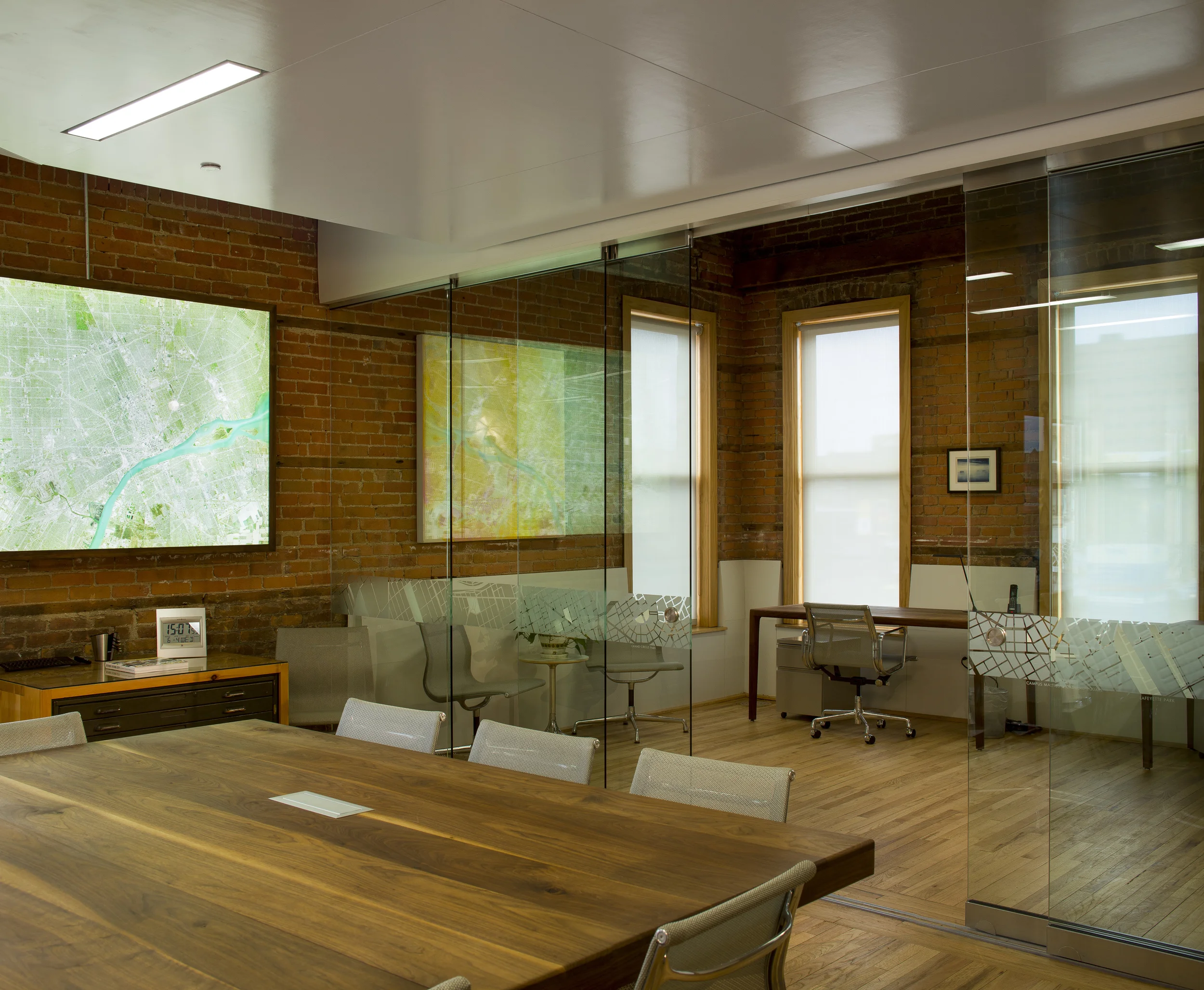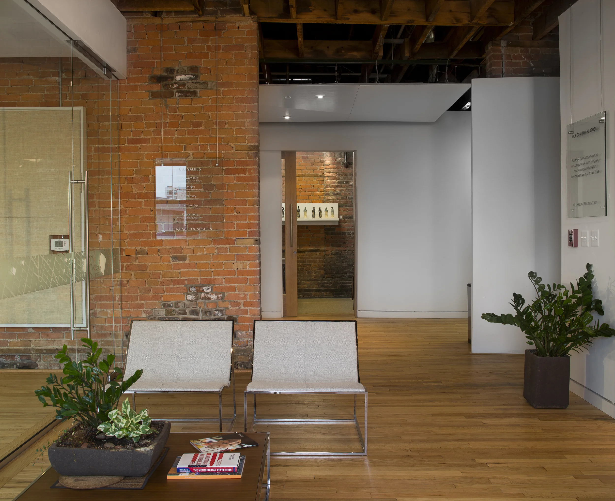 The Detroit office for the Kresge Foundation seeks to augment the beauty of a historic Midtown building, while embodying collegiality and sophistication. The solution deploys common elements such as gypsum board partitions, suspended ceilings, and a contemporary wainscot as a counterpoint to existing materials.